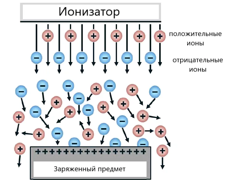 Рисунок 1. Принцип нейтрализации заряженного объекта ионизатором.