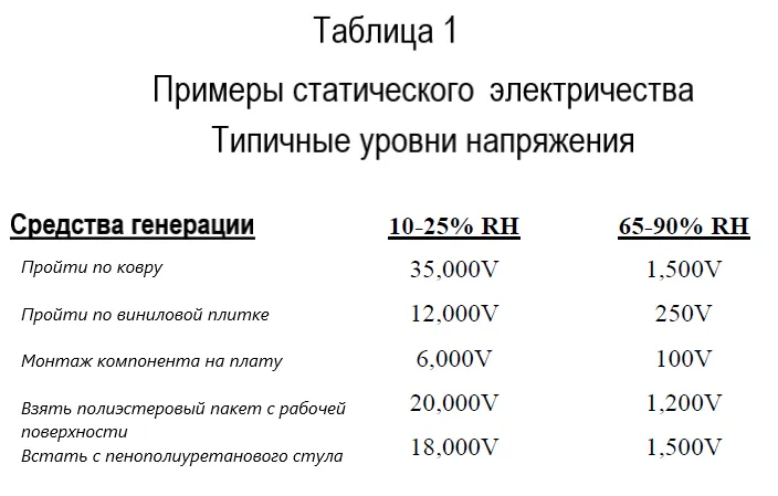 Этот процесс контакта материалов, переноса и разделение электронов представляет собой более сложный механизм, чем описан здесь. На количество заряда, создаваемого трибоэлектрической генерацией, влияют площадь контакта, скорость разделения, относительная влажность и взаимодействие материалов, рабочая поверхность и другие факторы. Как только заряд создается на материале, он становится электростатическим зарядом (если он остается на материале). Этот заряд может передаваться из материала – создание электростатического разряда или появления ESD. Дополнительные факторы, такие как сопротивление фактической разрядной цепи и контактное сопротивление на границе между контактирующими поверхностями, также влияют на фактический заряд, который высвобождается. Типичные сценарии генерации заряда и результирующие уровни напряжения показаны в Таблице 1. Кроме того, показано влияние влажности на уменьшение накопления заряда. Однако следует отметить, что статическая генерация заряда происходит даже при относительно высокой влажности.