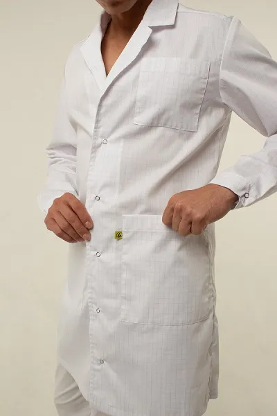 Антистатические халаты, специально разработанные для предотвращения повреждения чувствительных электронных компонентов, которые собираются или упаковываются на участках, защищенных от электростатического разряда. Антистатические халаты и костюмы должны быть изготовлены из проводящей ткани, чтобы гарантировать, что они устраняют возможность возникновение электростатического поля и предотвращают воздействие электростатических зарядов, создаваемых обычной одеждой. В целом, основная причина, по которой сотрудники должны носить антистатическую одежду, заключается в том, что она защищает ЧЭСР-компоненты от воздействия обычной одежды, а также применение антистатической должно свести к минимуму электрические поля, создаваемые обычной одеждой.