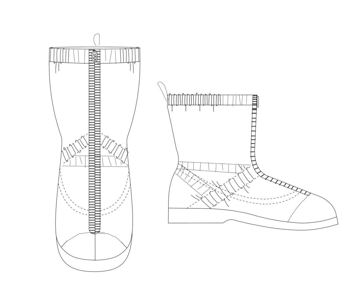 Бахилы застегиваются на молнию по переду изделия. Молния начинается от носовой части «сапожка» до верха. Подкладочная деталь в районе мыса носка выполнена их хлопчато-бумажной ткани.