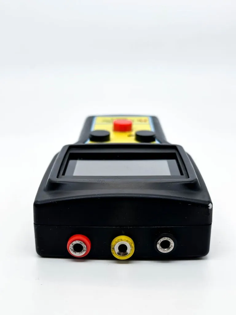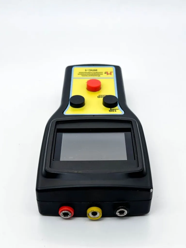 На лицевой панели измерителя располагается информационное табло, на котором отображается измеренное сопротивление, текущая температура и влажность в помещении. Дополнительно отображается величина заряда батареи прибора. С помощью двух кнопок осуществляется операция замера сопротивления. Одна из кнопок (черного цвета) изменяет величину испытательного напряжения (10 или 100В), вторая кнопка (нефиксируемая) производит операцию тестирования.