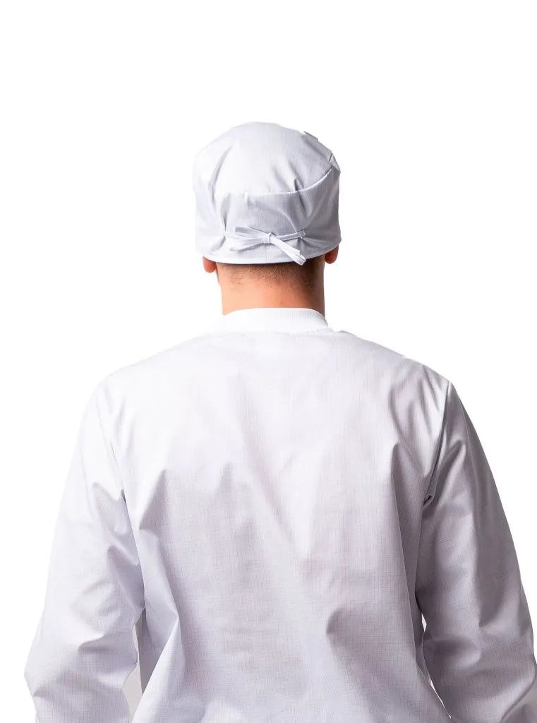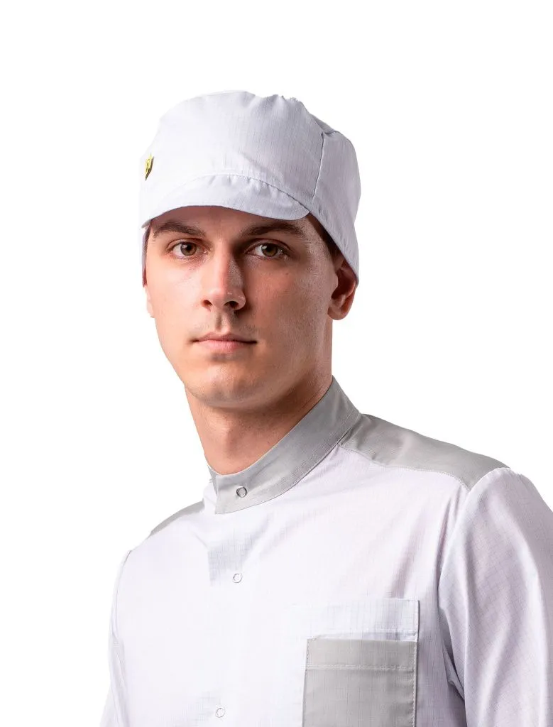 Колпак М-140 – головной убор с козырьком цилиндрической формы, плотно облегающий голову в лобной части. Для достижения прилегания к голове изделие фиксируется на затылочной части вшитой эластичной тесьмой. Модельные особенности призваны способствовать выполнению требований к промышленной чистоте.