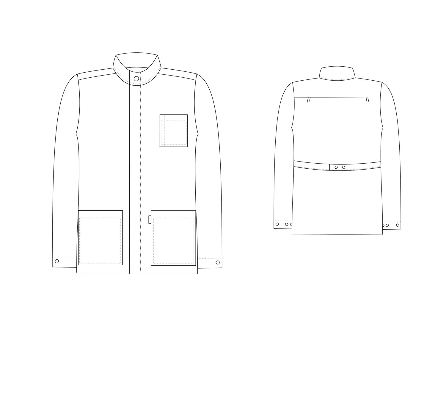 Куртка мужская М-454КК прямого силуэта с центральной супатной (потайной) бортовой застёжкой на кнопки, воротник – стойка с застёжкой на кнопку. Перед куртки цельнокроеный с двумя нижними накладными карманами и одним нагрудным накладным карманом, на котором отстрочено отделение под ручку. В левый нижний карман вшит знак EPA. Спинка с кокеткой, под которой заложены две складки. По линии талии расположен хлястик с застёжкой на кнопки.